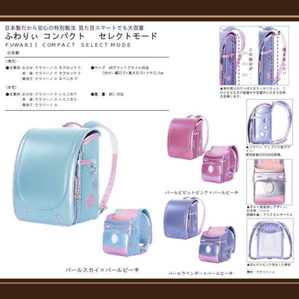 ふわりぃ コンパクト セレクトモード ランドセル 女児用 2016年度モデル 03-04555 パールスカイ/パールピーチ