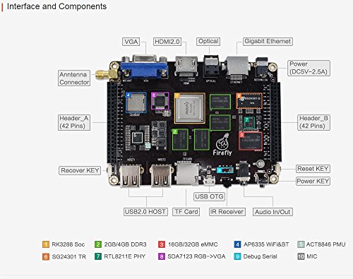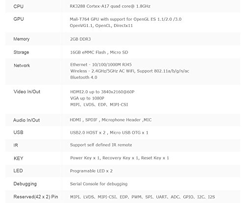 - IR:Support self defined IR remote. KEY:Power Key x 1, Recovery Key x 1, Reset Key x 1. LED:Programable LED x 2. Debugging:Serial Console for debugging. Reserved(42 x 2) Pin:MIPI,LVDS,MIPI-CSI,EDP,ISP,PWM,SPI,UART,ADC,GPIO,I2C,I2S. Power:5V/2.5A.
