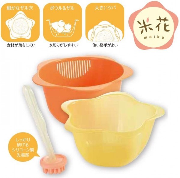 食卓にも飾れるボウル&ザルです。細やかなザル穴で食材が落ちにくく、大きめなツバは持ちやすく使いやすい仕様になっています。お花のような形状のボウル&ザルは、サラダなどを入れて食卓に置いても可愛いデザインです。先端部がシリコーン製の米とぎ棒はしっかりお米がとげます。 |