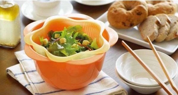 | 食卓にも飾れるボウル&ザルです。細やかなザル穴で食材が落ちにくく、大きめなツバは持ちやすく使いやすい仕様になっています。お花のような形状のボウル&ザルは、サラダなどを入れて食卓に置いても可愛いデザインです。先端部がシリコーン製の米とぎ棒はしっかりお米がとげます。 |