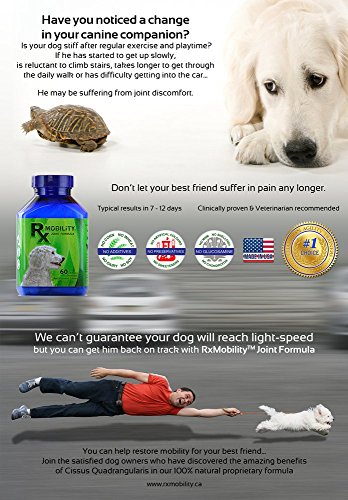 -. Binding : Misc. -. Brand : RxMobility -. EAN : 0702730599969 -. Feature : NEXT GENERATION nutraceutical for all sizes of active & aging dogs / CLINICALLY TESTED & PROVEN HUMAN-GRADE Bioactive Ingredients address allergy & dietary concerns / NO LOADING PHASE! Other popular joint supplements take weeks to work & only temporarily relieve pain & mask mobility problems / BOOST THE ABILITY TO HEAL damaged tissue & increase metabolism to combat weight gain / UNLEASH YOUR DOG'S POTENTIAL & decrease recovery time from exercise & injury with this preventative Daily Dietary Supplement -. Label : InMotion Health Science LLC -. LegalDisclaimer : Always read and comply with all labels, warnings, and directions before using or consuming a product. This product is not intended to diagnose, treat, or cure any disease. -. Manufacturer : InMotion Health Science LLC -. MPN : RXCB-37560 -. PackageQuantity : 1 -. PartNumber : RXCB-37560 -. ProductGroup : Pet Products -. ProductTypeName : PET_SUPPLIES -. Publisher : InMotion Health Science LLC -. Size : All Weight Categories -. Studio : InMotion Health Science LLC -. Title : RxMobility Botanical Hip & Joint Formula with Cissus Quadrangularis - Fast Absorption for Pain Relief & Maximum Mobility - #1 Choice of World Championship Dog Agility Trainers - Made in the USA! -. UPC : 702730599969