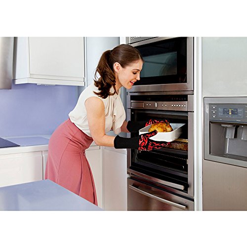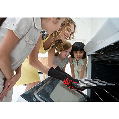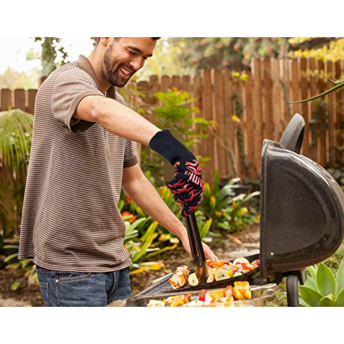 - Useful and practical design - long cuff grill mitts, can protect your hands and wrists from fire burn and heat; Thick but lightweight, five flexible fingers design and comfortable lining, give you pleasant using experience. One size fits most, easy to put on and take off; Black color background, dirt-resistant grill gloves, convenient to clean and machine washable; Portable, good for home and outdoors.