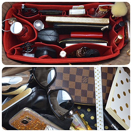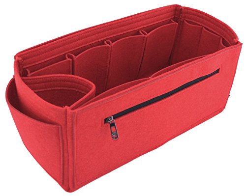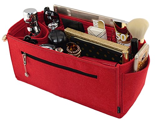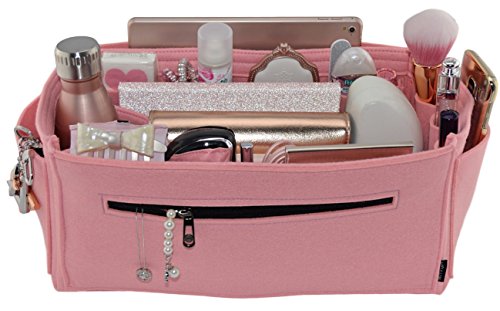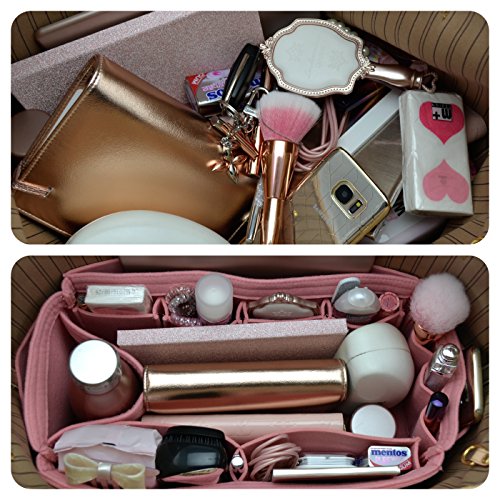 Product Description Made from polyester felt, more durable and holds shape better than wool and wool blend. Also means you can wipe or hand wash only. Zipped side pocket to store your secure documents, jewellery, or valuables. Cup holder to hold your bottles upright or store bulky items like sunglass case or umbrella Two end pockets, perfect to store keys, phone or small items Long narrow pocket that will fit ipad or small electronic notebook or small magazine or documents 4 small protruding side pockets to fit smaller sized cell phones, card holders, brushes, mints/candy, tissues, hand sanitizer, sunglasses, ear phones, tablet boxes Two larger sized producing pockets to fit bigger items like a cell phone, makeup, wallets, cosmetic pouch, hair brush. Narrow pocket in between to store a pen or slim makeup/brush/applicator 3 small makeup pockets at end of bag for lipstick lipgloss and makeup, nail file. Large roomy space to fit wallets and cosmetic pouches, diary or agendas. SIZE: GM: (L)15" x (H)6.7" x (W)6.7" 0