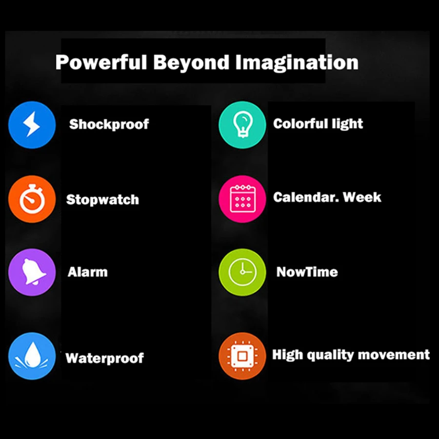 Feature:Water Resistant,LED display,Luminous,Stop Watch,Complete Calendar,Back Light,Week Display,Shock Resistant,Alarm