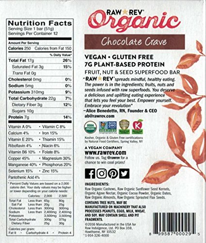 Raw Rev Organic Vegan, Gluten-Free Fruit, Nut, Seed Bars - Chocolate Crave 1.8 ounce (Pack of 12)