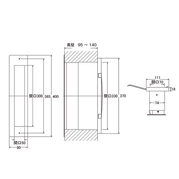 ●スペック:受口部:幅(mm)90 高さ(mm)400 取出し口開口寸法:幅(mm)69 高さ(mm)330 壁厚調整範囲95~140mm