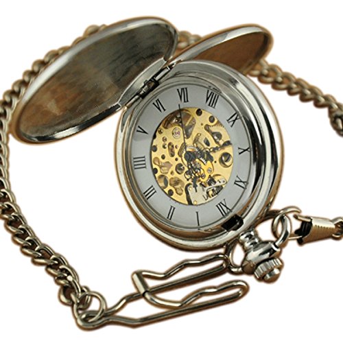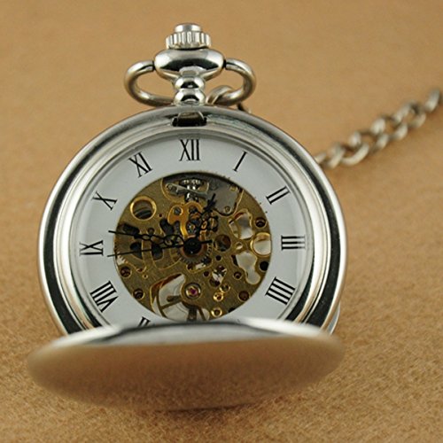 -. Feature : High Quality Mechanical Pocket Watch / Skeleton Dial With Roman Numerals Face / Silver Face / Double Hunter Fashion Design / Free Chain