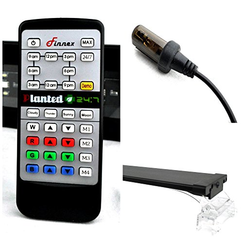 The Finnex Planted+ 24/7 LED fixture allows a hands free simulated sunrise & sunset to take effect atop user's aquariums. The 24/7 feature starts with a cool lit dawn, transitions in to a warm sunrise morning, followed by an intense color blazing high noon, scaling down to a red sun drowned sunset and finishes with a starry night blue moonlight. The cycle will repeat itself in real time, hands free, the following day. The fixture is equipped with a remote that allows day elements such as a Thunderstorms, Cloudy Days, Sunny Days and Moonlights to be activated with a click of a button. Also accessible via the IR controlled remote are four (4) memory slots in which a user can easily customize and save countless color combinations and lighting intensities if the user does not want to use the 24/7 feature. In addition to the dimmable Red, Green and Blue LEDs, the fixture also incorporates 7,000k Daylight LEDs to allow planted aquariums to thrive. Equipped with memory, the fixture remembers last saved settings as to make it compatible with standard timers. The fixture interacts with the controller via a water resistant IR sensor. The fixture's clear legs can slide inwards if need be to mount shorter aquariums. The legs feature screws capable of mounting rimless aquariums. For those with larger rimmed aquariums, the legs also feature a removable inner portion to accommodate such a width. Built out of quality constructed aluminum and featuring a water resistant splash guard, the 24/7 was built with longevity in mind.Feature