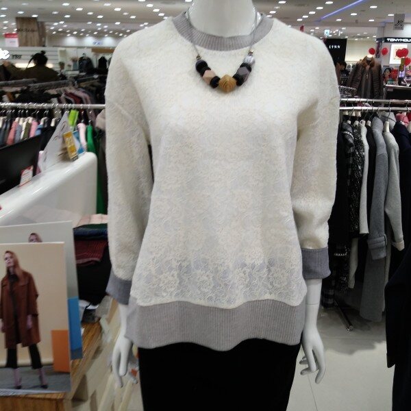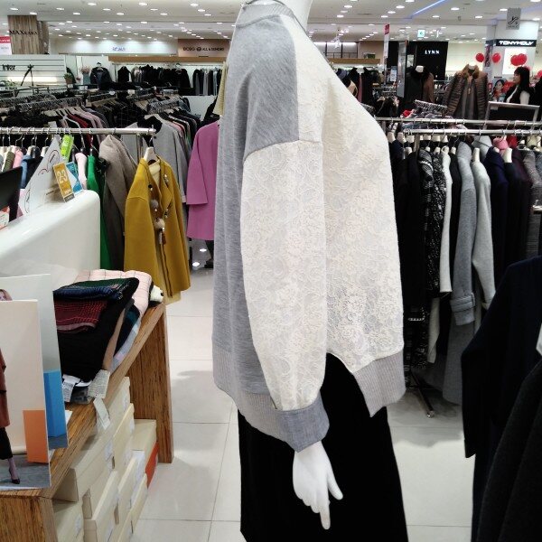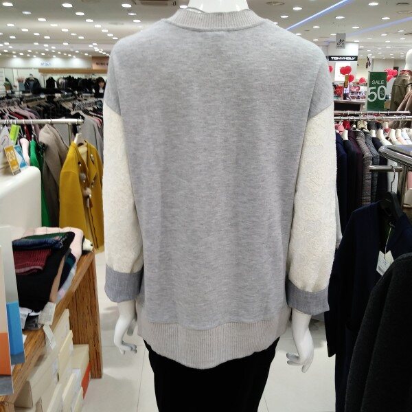 레이스원단의 고급스러움과 울포함 혼방소재로 간절기 이너로 적합ㆍ소매끝에 배색으로 포인트가 있어 깔끔하고 똑떨어지는 단정함이 돋보여요