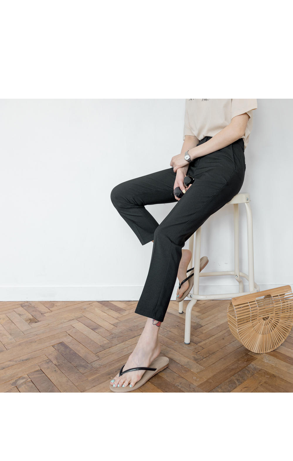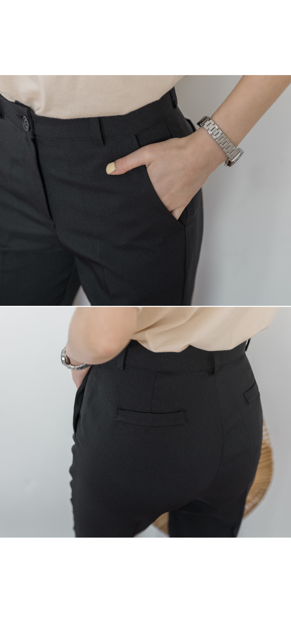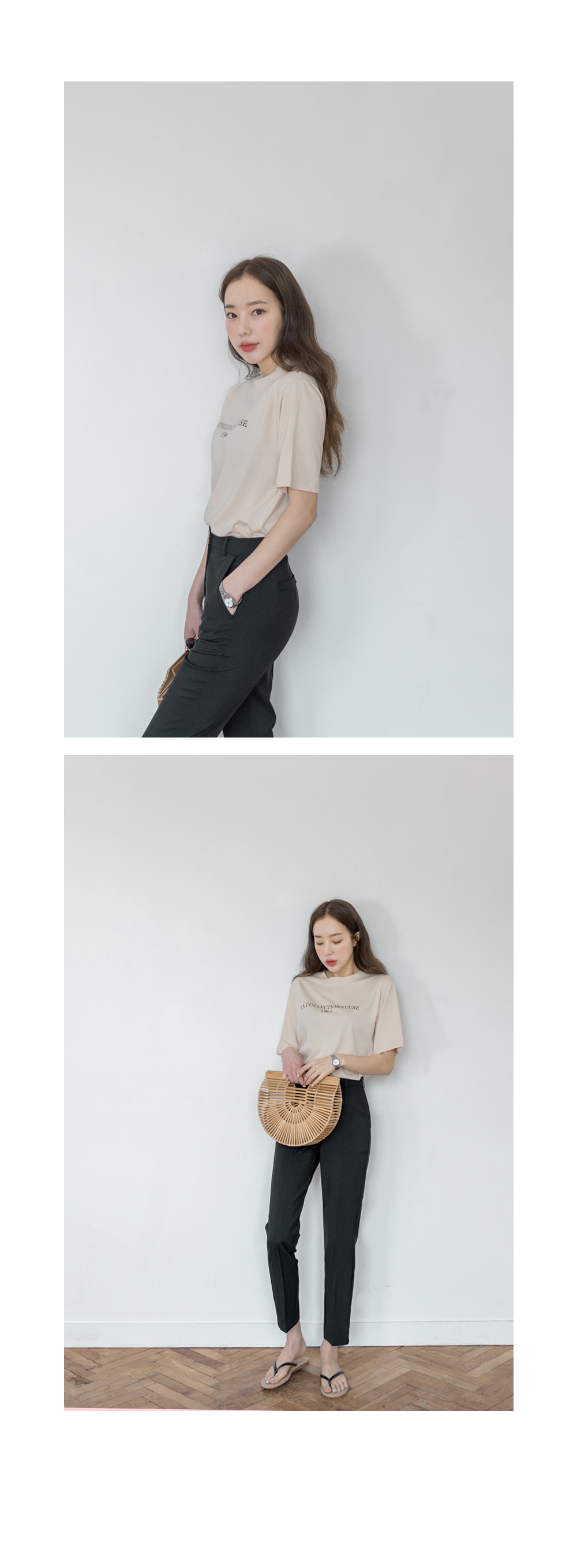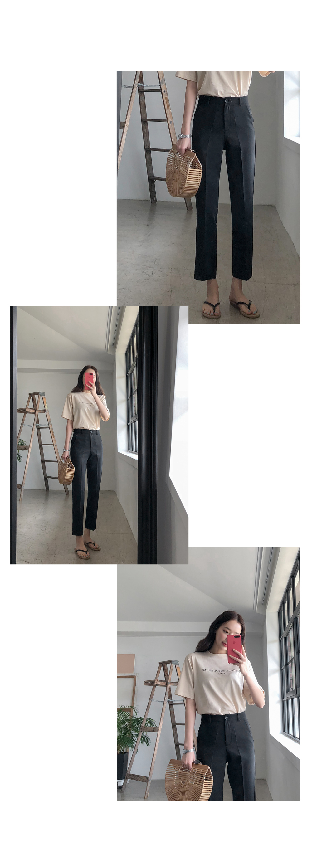 기본슬림한 핏감의 슬랙스로 허리부터 발목까지 가볍게 툭떨어져