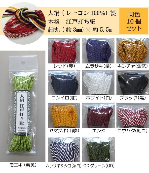 fk094igrjs人絹(レーヨン100%)製の本格的な江戸打ち紐です。色落ちを抑制する堅牢染めを採用。飾り紐や巾着袋の口紐など、和風装飾やホビー材に最適です。 製造国:中国 素材・材質:人絹(レーヨン100%) 商品サイズ:約3mm×5.5m セット内容:同色10個セット※お届け地域により、別途運賃がかかる場合やお届けできない場合がございますので、お問い合わせ下さい。