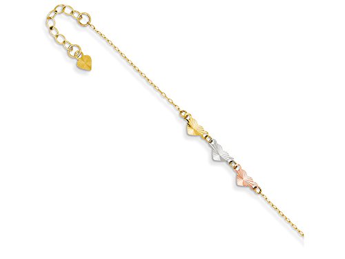 This delightful 9 Inch 14k Tri-color Adjustable Heart Anklet (Smaller Ankles), crafted in 14 kt Tri Color Gold . This style measures 4.00 mm wide, 9.00 Inches long. GIFT CARD OPTION WILL NOT BE AVAILABLE FOR THIS ITEM! UPC Code: 191320005209.Feature