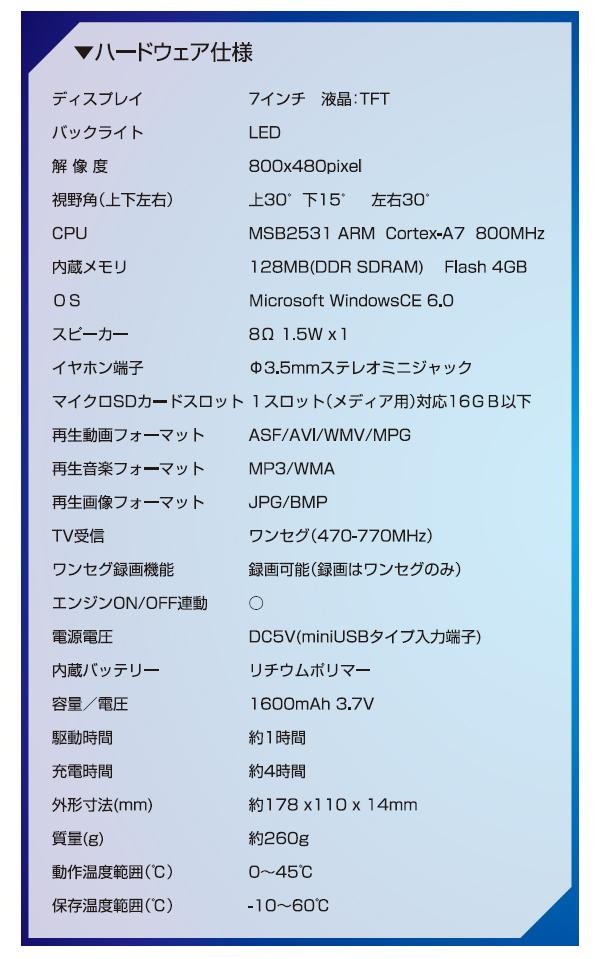 | 2018年度リリース地図を搭載した、7インチ大画面液晶のポータブルナビゲーションです。DCアダプター(シガーアダプター)、内蔵バッテリーの2電源対応で持ち運びも可能!!タッチパネル(感圧式)なので操作も簡単におこなえます。 |