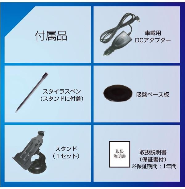2018年度リリース地図を搭載した、7インチ大画面液晶のポータブルナビゲーションです。DCアダプター(シガーアダプター)、内蔵バッテリーの2電源対応で持ち運びも可能!!タッチパネル(感圧式)なので操作も簡単におこなえます。 |