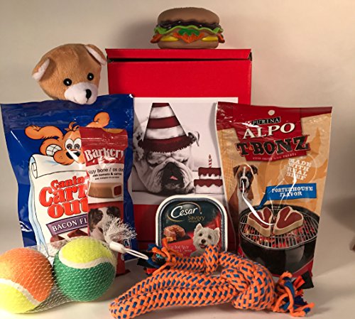 -. Feature : Be sure to check "THIS ORDER CONTAINS A GIFT" so that you can write a FREE message / 8 Items in Each Box: Rope Toy (Various Colors / Styles), Set of 2 Balls (Various Colors), Squeaky Toy (Various Foods), Barkey Biggy Bone Treat (Bacon Flavor Tomato and Carrot), 5 oz. Canine Carry Outs Bacon Flavor Treats, 3.5 oz. Cesar Savoy Delights Angus Beef Flavor with Bacon and Cheese (OR Filet Mignon Flavor in Meaty Juices), 4.5 oz Alpo TBONZ Porterhouse Flavor Dog Treats, and a Plush Animal Toy (Assorted Animals) / All packed in a red glossy, sturdy gift box (no cheap basket or flimsy cellophane), with a cute picture of a bull dog, tied with an elegant gold bow!