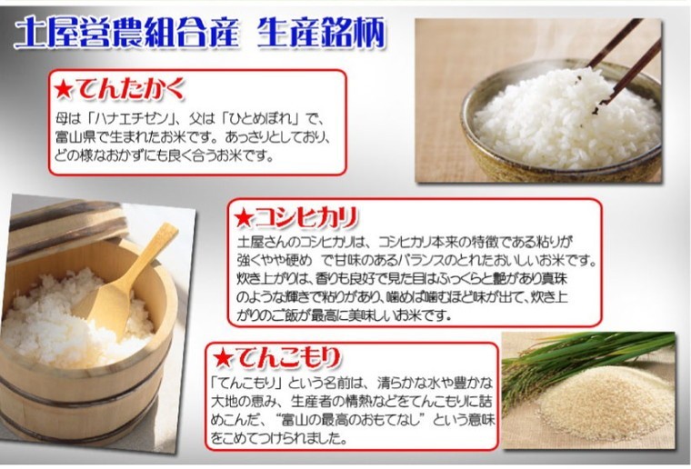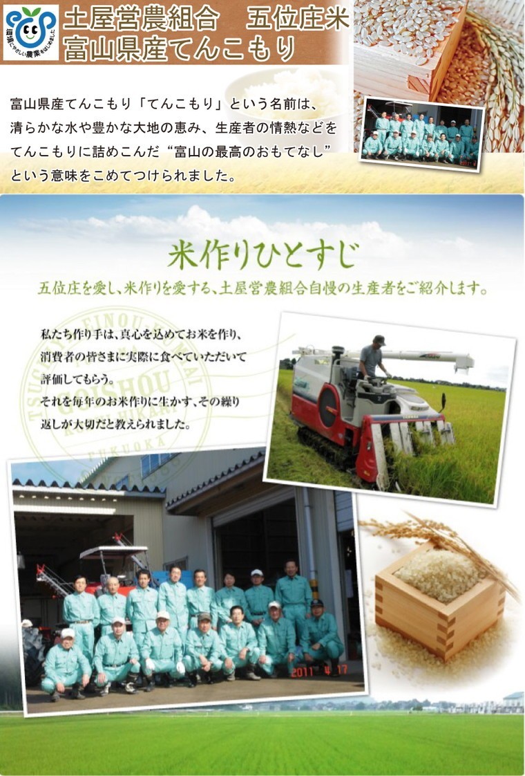 土屋営農組合 五位庄米 富山県産てんこもり!! 化学肥料だけに頼らず、全圃場に有機養分を投入し、粘土質の肥沃な土地で作られる米をさらに「煌めく米、香しい米」にしたものが「五位庄米」です。!!もちもち感で、冷めても硬くならず、おにぎりにも最適!!※分搗き精米商品は、精米方法により目減りいたします。精白米の場合は、約1割がヌカとなります