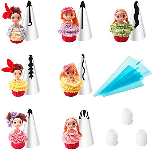 - HIGH-QUALITY 304 STAINLESS STEEL RUSSIAN RUFFLE TIPS & 7 CUPCAKE DOLLS: This russian ruffle piping tips made of high quality 304 stainless steel, which are exceptionally strong, durable, health and safe. The set with 7 beautiful girl dolls. 7 kinds of patterns can be choosen, you can create some unique dresses, skirts and designs for your cupcake or cake doll. (The color of dolls' headgear is random).