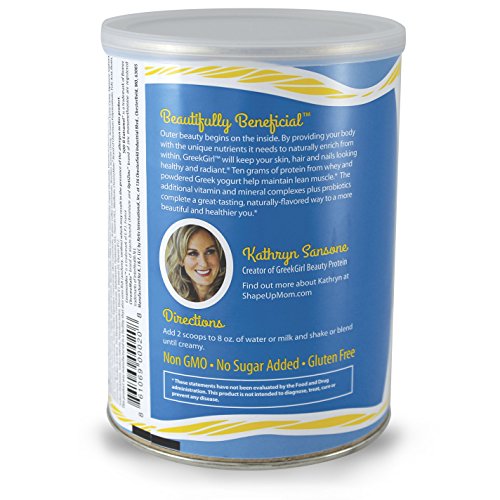 -. Feature : SPECIFICALLY DESIGNED FOR WOMEN! GreekGirl fills a void in the protein offerings for women: A protein supplement that enhances hair, skin, and nails, supports lean muscle and provides satiety for a busy women's day. It's a first-of-its-kind Greek yogurt and Whey protein blend offereing timeless benefits internally while revitalizing your skin with that healthy glow. / EXCELLENT TASTE AND GREAT RESULTS! An all-natural Greek yogurt and whey protein powder, GreekGirl delivers 10 grams of protein, plus a daily dose of vitamins, minerals and beneficial probiotics to ensure a healthy balance in one delicoius serving. Not only does it help build and maintain lean muscle, but GreekGirl also provides noticeable benefits to the body's hair, skin and nails. / FEEL BEAUTIFUL INSIDE AND OUT! GreekGirl protein powder for women presents benefits to all women who are already used to, or are getting acclimated to a hectic lifestyle, but still take their personal health and outward appearance seriously. Daughters, sisters, moms, nieces, aunts, best friends and even grandmothers: GreekGirl is there for any woman who wants to feel beautiful, inside and out. / UNBELIEVABLE BENEFITS! Each serving of GreekGirl beauty protein contains ONLY 50 Calories, ONLY 2 Carbs, Essential Vitamins & Minerals, Enhances Hair, Skin, and Nails, 10 Grams of Whey Protein and Probiotics. GreekGirl is also Gluten Free, Non-GMO, and there is NO Sugar Added. You would need up to 6 individual supplements to provide all of the benefits found in one serving of GreekGirl! / MIX WITH ALMOST ANYTHING! GreekGirl protein for women tastes wonderful when mixed with 8 oz. of water, milk or almond milk. If you are feeling adventurous, you can mix your GreekGirl into your coffee in the morning, an afternoon smoothie, or even a milkshake for desert! The possibilities are endless!