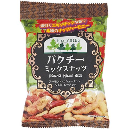 原材料:落花生、アーモンド、くるみ、カシューナッツ、植物油、食塩、乾燥コリアンダーリーフ/香料、調味料(アミノ酸)、(一部に落花生・くるみ・カシューナッツ・大豆を含む)