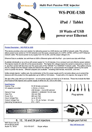 WS-POE-USB-Kit for iPad or Tablet, Remote USB Charger Via PoE Ethernet Cable up To 328 Feet With 5 Volts 10 Watts and Female USB