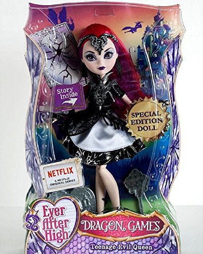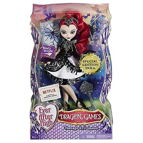 Join the Dragon Games with this Ever After High teenage Evil Queen doll! In their most epic adventure yet, the teenage sons and daughters of the most famous fairytales ever see the return of dragons to Ever After High -- and the return of the most amazing sport ever after, Dragon Games! But all is not fun and games when the Evil Queen joins in, especially because she has magically transformed herself to look like a student. Trying to blend in at Ever After High, the villain from Snow White looks hexquisite in a black and white dress with metallic print, multi-layered skirt and fableous accessories. Fans can get the hexclusive scoop on her evil plot for the event of the year with the included storybook and capture epic poses using the doll stand. Let the games begin! Collect all of the Ever After High Dragon Games dolls to tell your own epic tale (each sold separately, subject to availability). Includes teenage Evil Queen doll wearing fashions and accessories, doll stand and storybook. Doll cannot stand alone. Colors and decorations may vary.Feature
