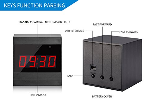 -. Feature : [Hidden Camera Clock]A camera inside in regular clock.100% invisible lens, nobody will notice and recognize there is a spy camera in your home or car or office.Suitable for pet/baby monitor, nanny camera home and office security and surveillance. / [LIVE VIDEO]With APP,you can know everything by watching you cell phone/pad and computer anywhere anytime while the camera connect to WiFi.App is compatible with both iOS and Android smartphones. / [Motion Detection]With built-in high accuracy motion detection technology, the camera sends notifications to your mobile phone alerting when, where, and what movement was detected so you always stay on top of things that matter. / [Full HD 1080P Video]Full HD 1920 x 1080P video resolution, motion detection and 120°wide view angle giving you a clear view, No special software is needed for playback, we recommend P2P Live Cam. / [NIGHT VISION]The camera has two types of Protection Film,there are 6 IR night vision sensors in front of the camera clock , if you use the transparent protection film, The night vision distance up to 20 feet.The package include a rechargeable battery, which could allow up to 15 hours recording after fully charged.