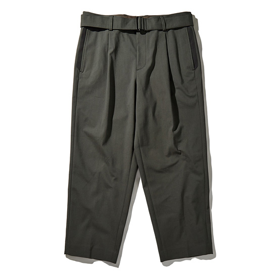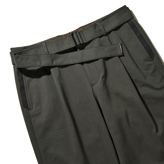 - 브랜드 로고를 적용한 볼드한 고리의 벨트가 돋보이는 남성 팬츠.