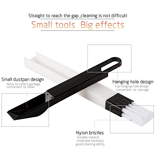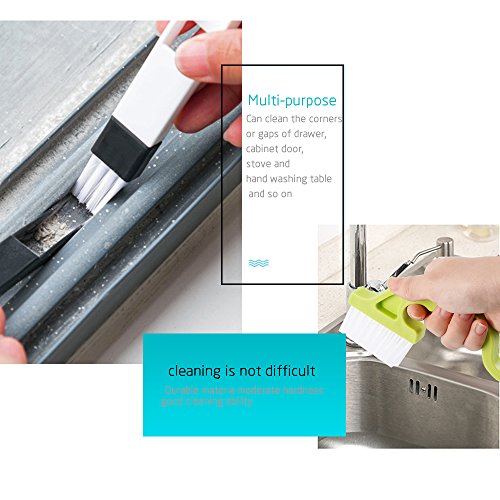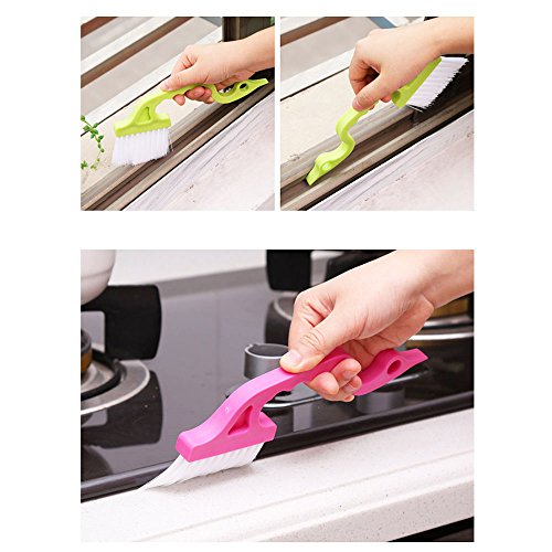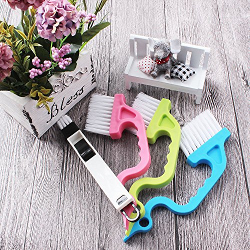 -. Feature : Package includes 3 pcs window track cleaning brushes blue, pink, green and 1pcs dustpan cleaning brushes / Made of high quality PP material, curve design, gives you a comfortable grip / Hole design and nylon bristles, easy to hang up and clean, occupy less space / 2-in-1 design, one end cleaning brush to sweep away loose dirt, the other end scraper to dislodge stubborn dirt / Flat design brush makes windows and shower tracks with ease and quick