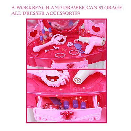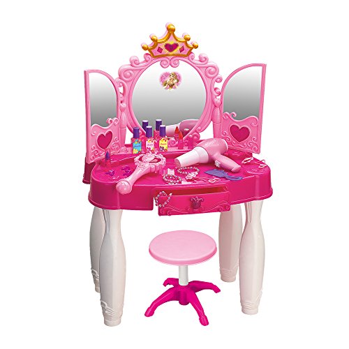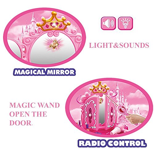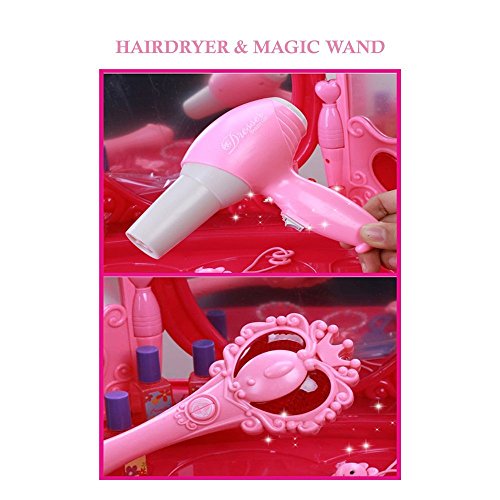 Enjoy Hours of Dress Up FunThis vanity toy set includes everything a child could imagine in a vanity set. The girls vanity set will keep her occupied for hours of fun and pretend play. Already played with the cosmetics for hours and want now to switch your play toy? Press the magic wand can open and close the dresser door by infrared control. How magic time for little girls. Your little girls will become a princess, a fairy, a superstar and a stylist. A great gift idea for kids who deserve it. A great pretend play toy that make girls' dream come true. Nice big colored packaging.