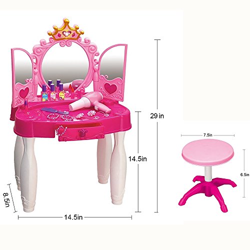 Beautiful vanity set with mirror and stool to sit on including jewelries, cosmetics, hair accessories, dresser table with mirror, stool, magic wand and working hair dryer. Dimensions of assembled vanity: 14.5(L) x 14.5(W) x 29(H) inches. Dimensions of bench: 7.5(L) x 8.5(W) x 6.5(H) inches