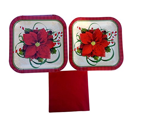 Red Poinsettia Christmas Pary Supplies. Pretty Supply Plates and Dinnerware Pack (Red napkins)