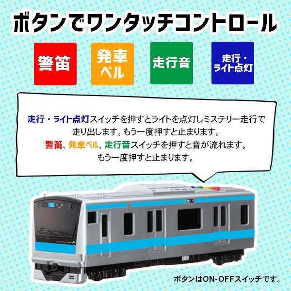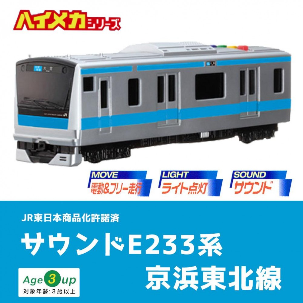 光と音とアクションが魅力のハイメカシリーズ!!ノンストップのミステリー走行&手押しで遊べる、大きなサイズのE233系京浜東北線のおもちゃ♪フリー走行では物に当たると方向を変えるミステリーアクションが特徴。ライトの点灯、警笛・発車ベル・走行音のサウンドがボタン操作でコントロール可能です。手動でドアの開閉も可能です。 |