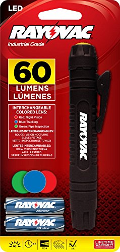 -. Feature : Sale Unit: EACH / Brand: Rayovac / Product Type: Pen Light / Bulb Type: LED / Lumens : 60 / High performance Cree XP-C P4 LED / Polymer body, impact, chemical, water and corrosion resistant / Three colored lens included, red night vision, blue for tracking and green for map reading / Holster with lens storage included / Included 2AA batteries