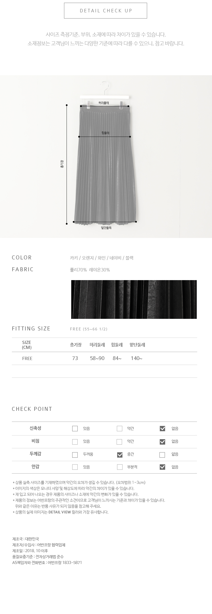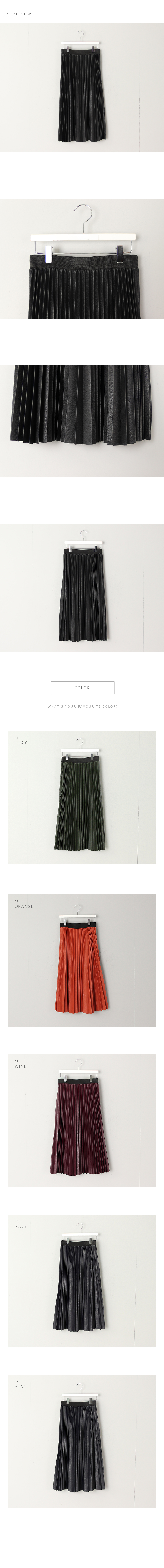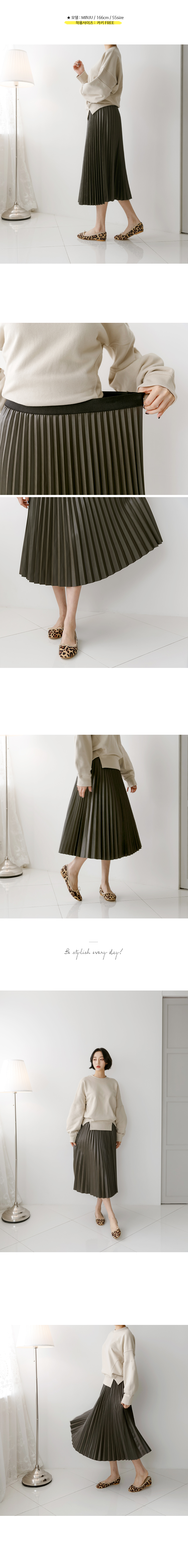 세련된 라인의 페이크 레더 플리츠스커트섬세하게 잡은 기계 주름의 페이크 레더 아이템으로세련되고 시크한 매력에매 시즌 사랑받는 스테디셀러 아이템이랍니다.전체 허리 밴딩으로 사이즈에 크게 구애받지 않고편하게 입기 좋으며밴드 아래로 자연스럽게 주름이 시작돼 퍼지는 스타일로스타일링하기 좋답니다^^색상은 실버, 카키, 와인, 딥그린, 블랙사이즈는 FREE 55~66반까지 가능하답니다.