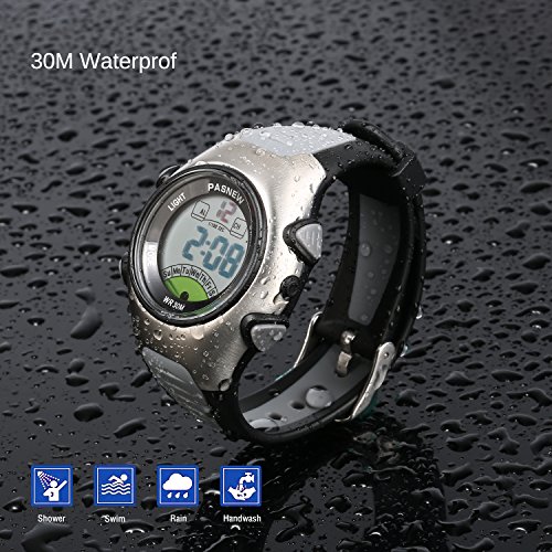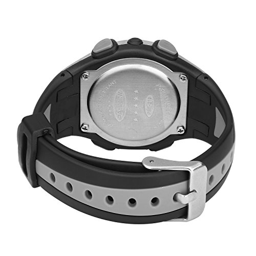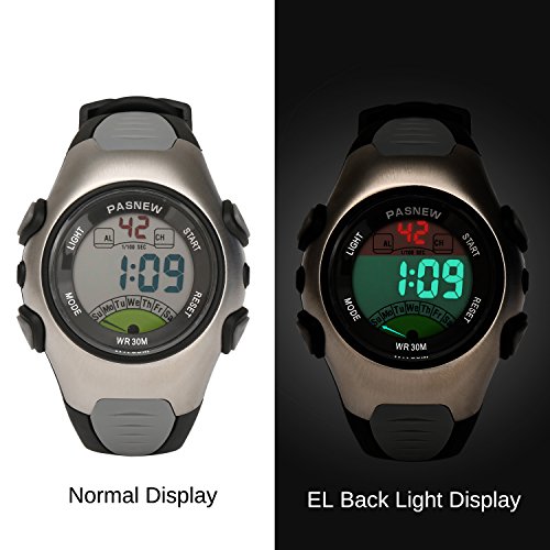 This waterproof watch with digital display has a durable PU band, stainless steel back and EL backlight for the night. It is lightweight and very comfortable to wear.