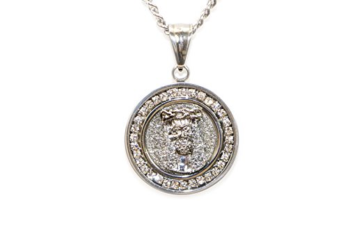 -. Title : Jewels Fashion Stainless steel Rhodium Plated Round Charm With Jesus Face Pendent 24 MM ,0.90"inch Width With Diamond Cut and Cubic Zirconia Stones And 22" Inch Curb Chain