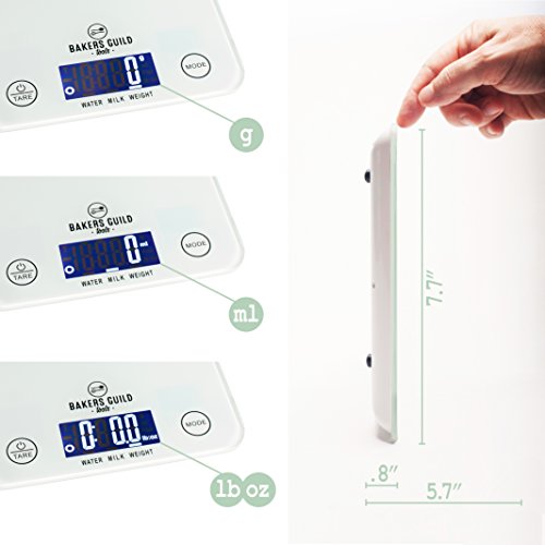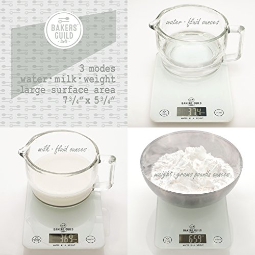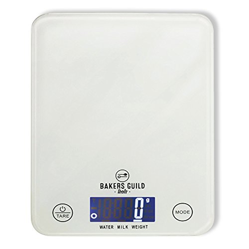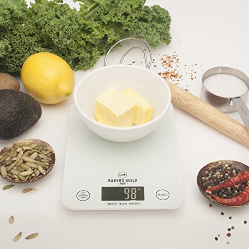 Digital Kitchen Food Scale (White), Fluid Ounces for Milk and Water, Weight in Grams, Ounces and Pounds (Batteries Included) – By Bakers Guild Tools