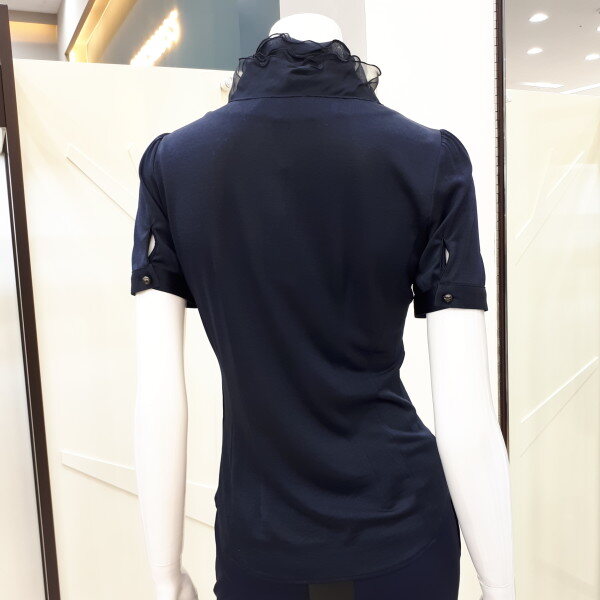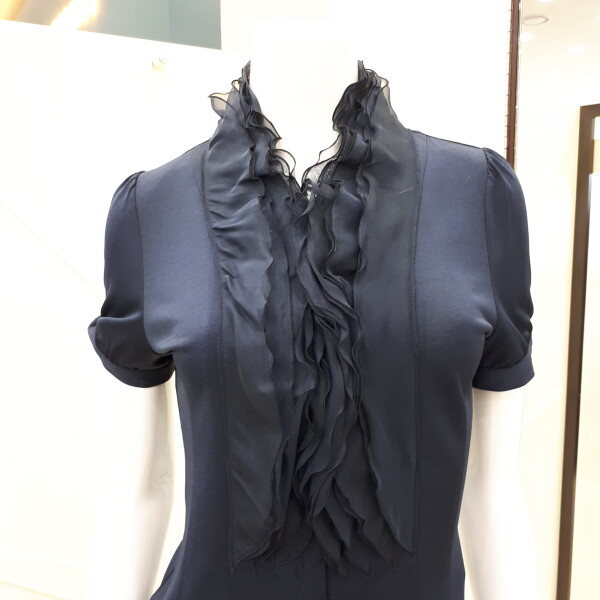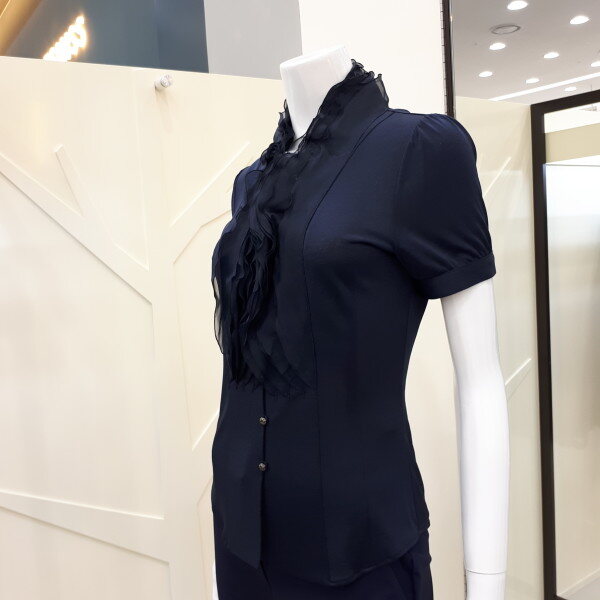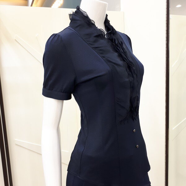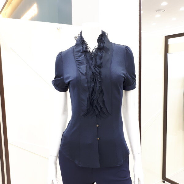 실크100%의 배색으로 처리된 고급스런 프릴 블라우스입니다^^풍성하고 화려한 프릴이 특징이며허리선이 강조된 디자인 입니다^^
