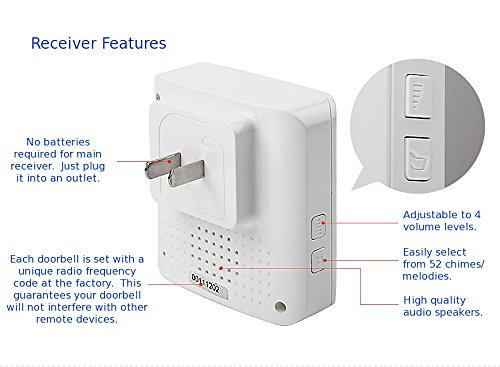 Easily plug receiver into an electrical outlet (no batteries required for main receiver). CE, FCC, RoHS certified.