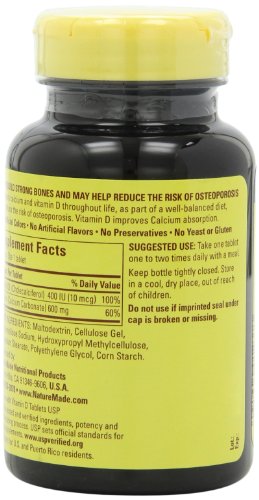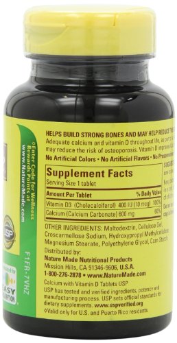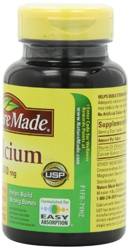 -. Binding : Health and Beauty -. Brand : Nature Made -. EAN : 0031604012373 -. Feature : Specially formulated to increase calcium absorption to help build and maintain strong bones and teeth / Helps build and maintain strong bones and teeth / May also help prevent osteoporosis. / Tablets are also formulated for easy absorption / Easy to swallow -. IsAdultProduct : 0 -. Label : Nature Made -. Manufacturer : Nature Made -. NumberOfItems : 3 -. PackageQuantity : 3 -. ProductGroup : Health and Beauty -. ProductTypeName : HEALTH_PERSONAL_CARE -. Publisher : Nature Made -. Studio : Nature Made -. Title : Nature Made Calcium 600mg with Vitamin D, 120 Tablets (Pack of 3) -. UPC : 031604012373