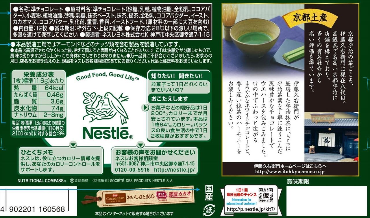原材料:準チョコレート(砂糖、乳糖、植物油脂、全粉乳、ココアバター)、小麦粉、植物油脂、砂糖、乳糖、抹茶ペースト、抹茶、緑茶、全粉乳、ココアパウダー、イースト、カカオマス、ココアバター、乳化剤、重曹、香料、イーストフード、(原材料の一部に大豆を含む)商品サイズ(高さx奥行x幅):123mm×22mm×201mm