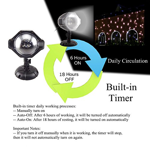 - 【 BUILT-IN TIMER 】This snow falling projector light is designed with built-in timer with daily circulation. As long as you turn it on and keep it running on, it will continually work for 6 hours, and automatically shuts down, then automatically turns on after 18 hours break. But please note that if you turn it off manually, it will not turn on by itself.