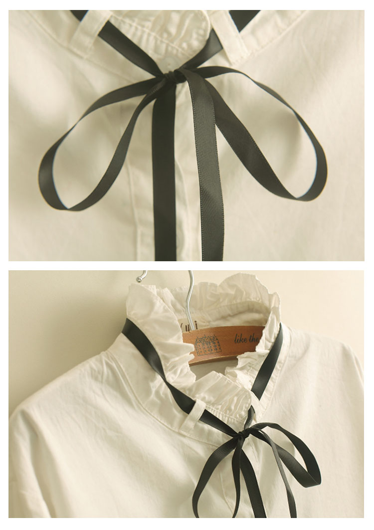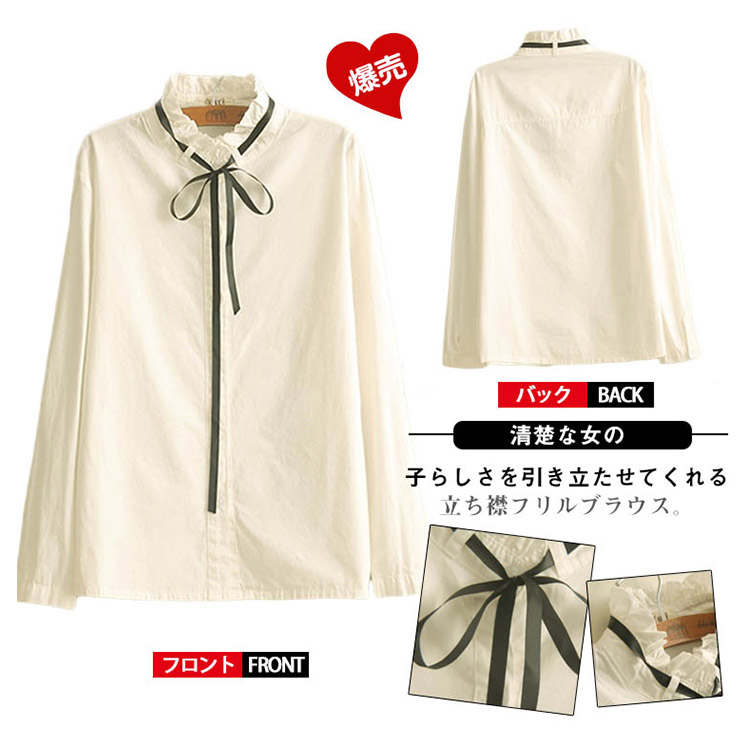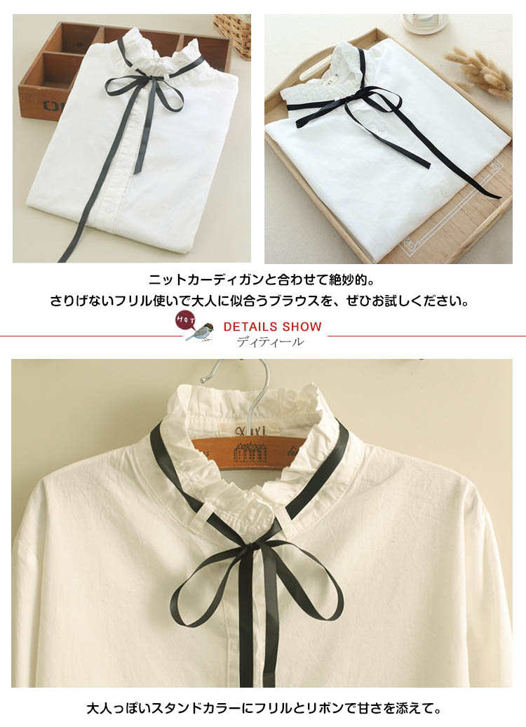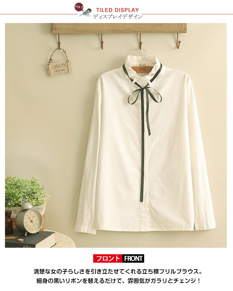 | 清楚な女の子らしさを引き立たせてくれる立ち襟フリルブラウス。細身の黒いリボンを替えるだけで、雰囲気がガラリとチェンジ!大人感と甘さが絶妙に混ざり合った、こだわりのデザインが魅力です。素材は、優しい肌あたりのコットン生地です。ニットカーディガンと合わせて絶妙的。さりげないフリル使いで大人に似合うブラウスを、ぜひお試しください。 | |
