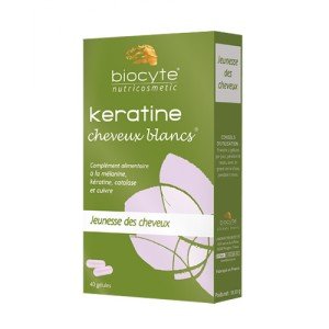 -. Feature : Biocyte Keratine White Hair Youth of Hair 40 Capsules is a food complement specially formulated for persons who want to keep a beautiful and young hair. / The sun, the wind, the sea, the food, the hormonal variations but also the pollution, the stress, the fatigue, the chemical treatments and the natural ageing modify the keratin of the hair, makin it breakable and facilitating its fall and its discoloration. / Rich in keratin, melanin, catalase and copper, this food complement leaves your hair apparently more brilliant, younger and more beautiful.