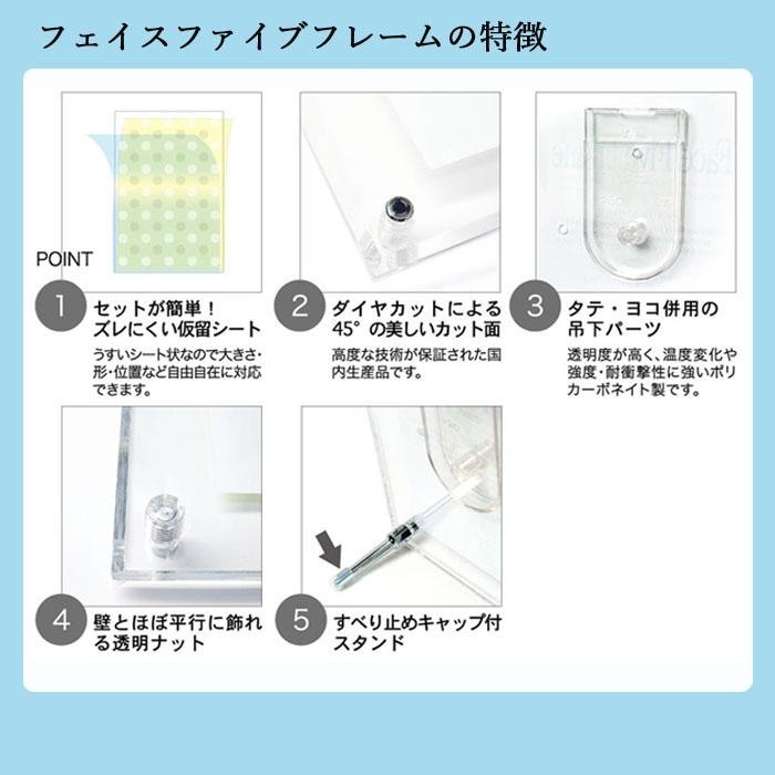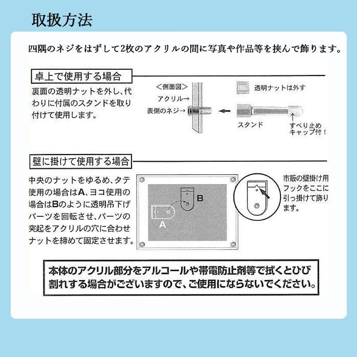 純度99%の高純度アクリルを使用し、高度な技術による美しいカット面が特徴のフォトフレームです。透明度が高いので、時間の経過による黄変がほとんどありません。シンプルなデザインかつ、壁にかけても置いてもご使用いただけるので、場所を選びません。お部屋の色々な場所に大切な絵や賞状、写真、ポスターなどを飾っていただくことができます。 |