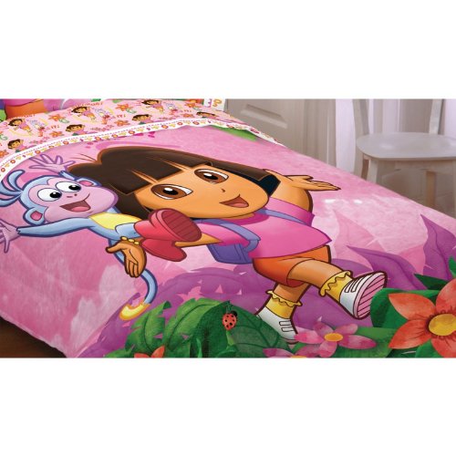 Studio : Franco Mfg Publisher : Franco Mfg Product Description Dora and Boots are getting ready for their next adventure. Come along as they go exploring together on this fun and brightly colored comforter, which will accommodate both a twin and full sized bed. The shell is made of 100% polyester microfiber for smooth and soft hand. The fill is 100% polyester for a plump, warm and durable covering. The product is machine washable. 0