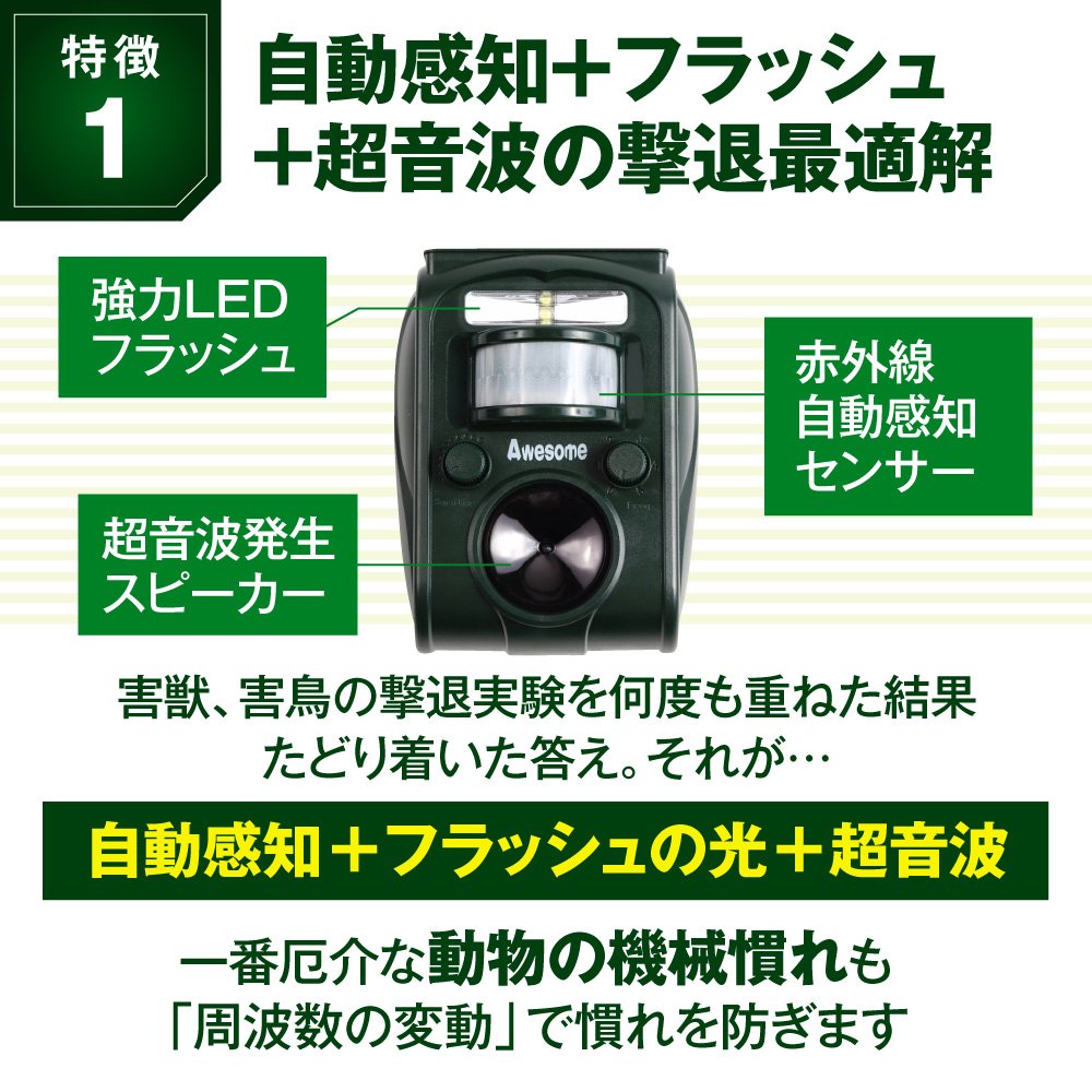 Protect from all harm by automatic infrared sensing + strong flash + ultrasonic wave + warning.