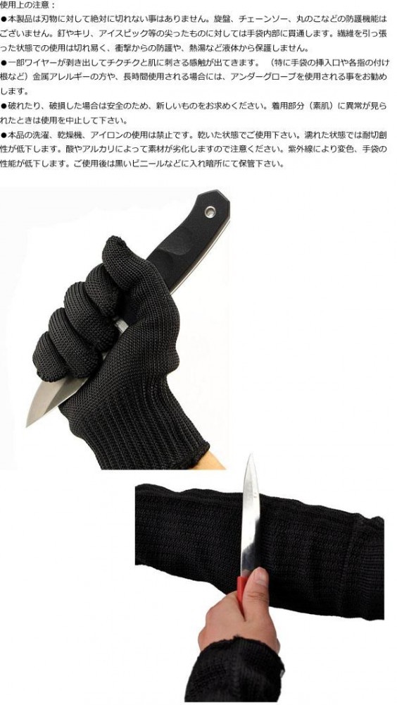 | 内部にステンレスを編み込んであるので、優れたカッティングプロテクト性能を持ちます。 耐久性と耐摩耗性も兼ね備え、アウトドア・BBQ・ガーデニング・ガラス・陶器、金属加工処理・彫刻、工作時に大活躍します。 |