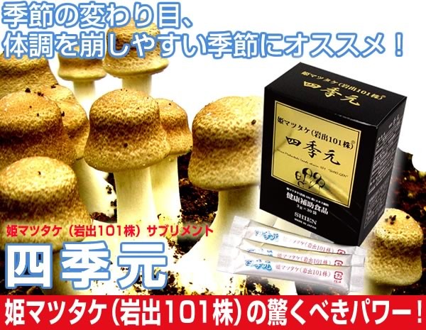 四季元は姫マツタケの最も生理活性の高い有効成分「β-(1→6)-D-グルカン」をはじめとするたんぱく多糖体がキチンと身体に届き、体調を崩しやすい季節の健康をサポート! 製造国:日本製 商品区分:健康食品 名称:姫マツタケエキス顆粒 保存方法:直射日光を避け、冷暗所で保存してください。※お届け地域により、別途運賃がかかる場合やお届けできない場合がございますので、お問い合わせ下さい。