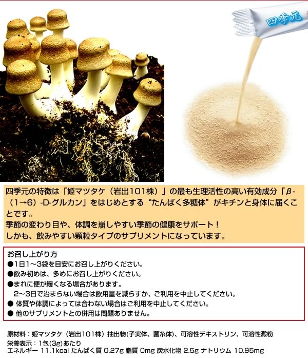四季元は姫マツタケの最も生理活性の高い有効成分「β-(1→6)-D-グルカン」をはじめとするたんぱく多糖体がキチンと身体に届き、体調を崩しやすい季節の健康をサポート!